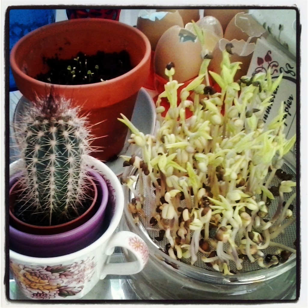 Is taugé ook limonade maken, vraag ik me af. In het klaaglijke gemiauw van de kat denk ik een ja te horen. Nou denk ik dat de definitie van limonade van Willy de wonderkat zelfs kattenbrokjes zou omhelzen, of misschien juist, en melk en kattengras, maar ach, wat maakt het uit. Terwijl overal in huis gezaaide zaadjes heel voorzichtig en dapper hun kwetsbare kopjes boven de aarde uitsteken, is de taugé dat stadium allang voorbij. Ik heb een heel bos aan taugé op mijn plantentafeltje. Eet mij, roept het vanaf het kiemschaaltje. En dat zullen we dan maar doen. Het menu voor vandaag: gewokte tofu en taugé in ketjapsaus.
