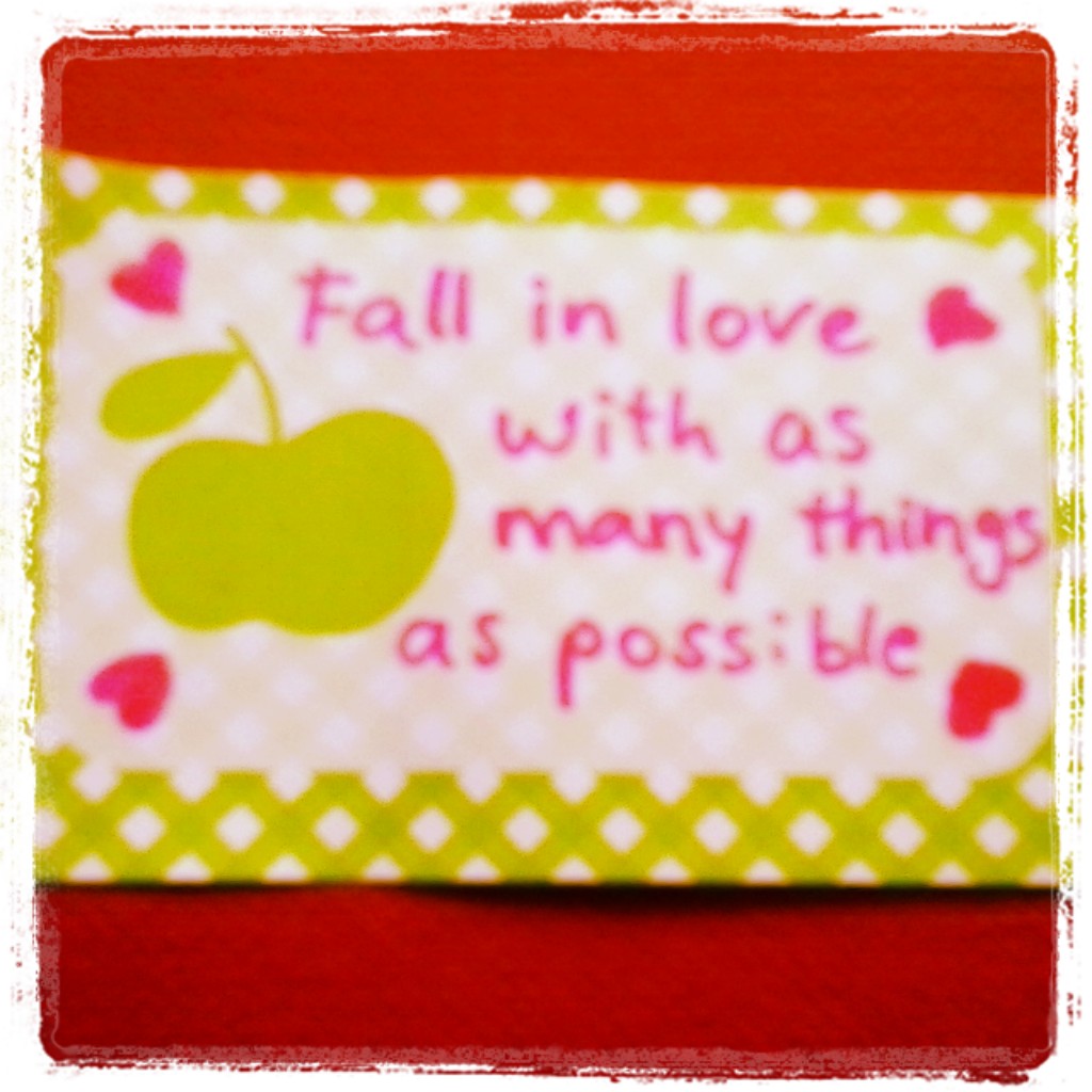 Op mijn bureau zwerven altijd briefjes rond met mooie uitspraken, of gewoon dingen die ik af en toe wil tegenkomen als korte reminders om van het leven te genieten, af en toe rust te nemen, aan mezelf te denken, aan anderen te denken. Dit is daar een van. Fall in love with as many things as possible. Oké, mijn zondagochtendlijst:
