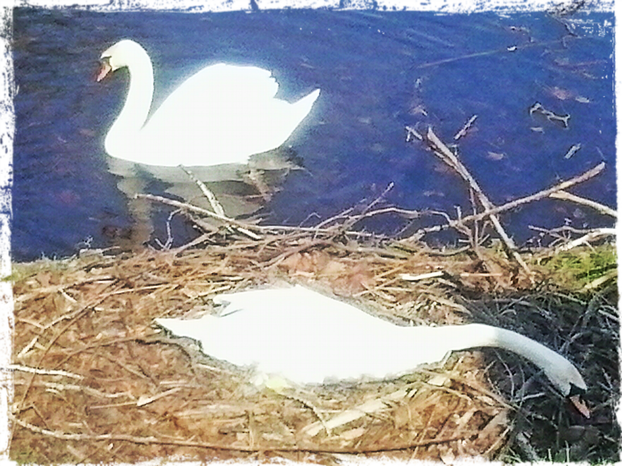 Wat een heerlijke dag was het gisteren. Iedereen leek aan de wandel. Mensen met blote armen, een enkeling zelfs al met blote benen, overal blije gezichten, vriendelijke glimlachen, alle terrasjes vol. Ik wandelde met een omweg door het park naar het terras en kwam toen dit zwanenechtpaar tegen. Het moment dat het vrouwtje het grote ei waarop ze zit te broeden even liet zien ging te snel voorbij om er een duidelijke foto van te maken, maar geloof me, het was gigantisch. Een mega-ei. Moet natuurlijk ook wel als er zo’n grote vogel uit moet komen, maar dan nog. Terwijl het mannetje rare fratsen uithaalde in het water –hij was onder andere een watermeter aan het slopen-, bleef het vrouwtje rustig zitten, heel mindful rangschikte ze de takjes om haar heen verder tot een goed nest. Ze trok zich weinig aan van alle aandacht die ze kreeg van schreeuwende kinderen, wijzende mensen en fotograferende bloggers. Het lijkt me geweldig als je je zo van alles kan afsluiten. Als je midden in de drukte je rust kan vinden. Ik neem dit beeld mee ter inspiratie. Een volgende keer als ik me onrustig voel visualiseer ik deze vrouwtjeszwaan en trek me terug in mijn imaginaire verenkleed, tussen mijn grote vleugels.