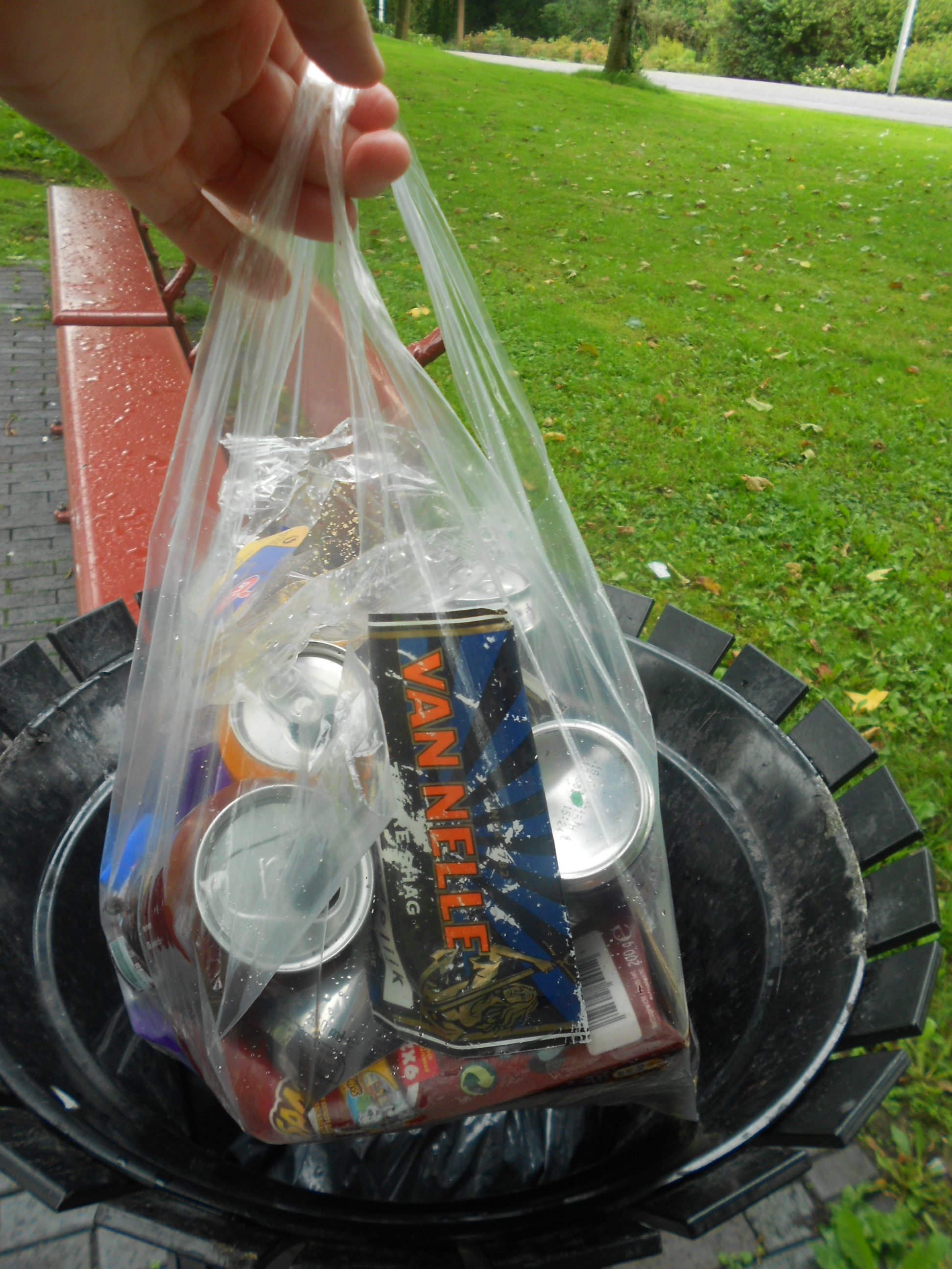 Vandaag gingen acht blikjes drinken, een pakje shag, een pak koekjes en vijf zakken chips de vuilnisbak in. Rapen jullie ook iets op vandaag?