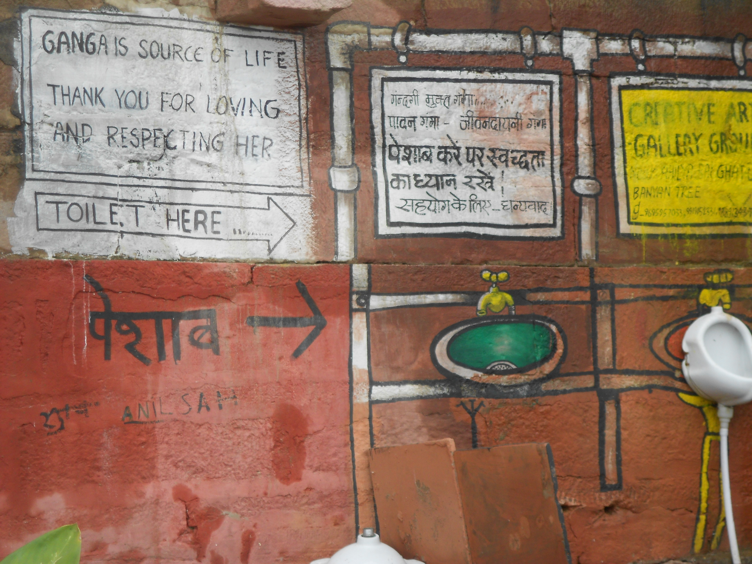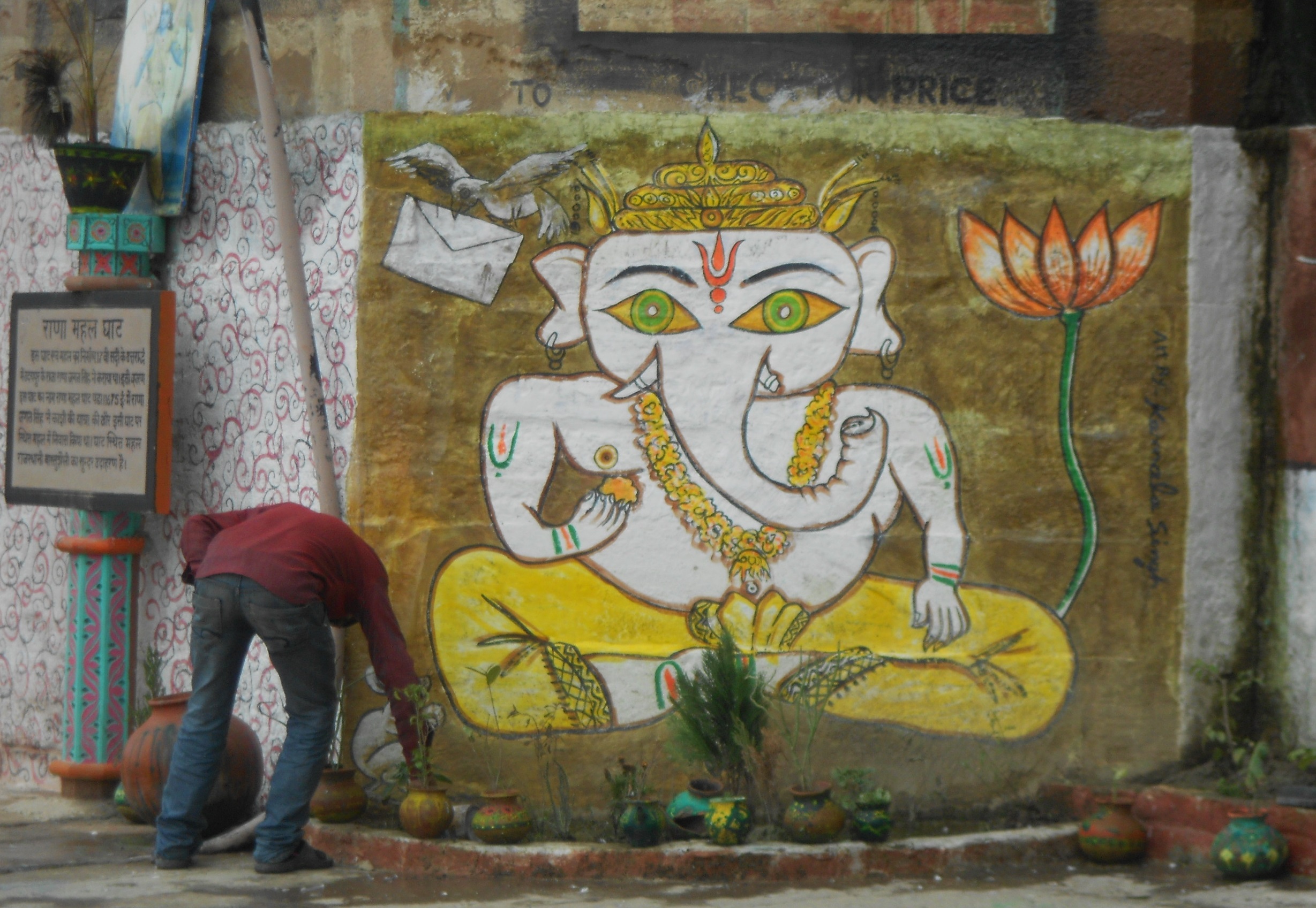 DSCN3374Op een dag liep Ravi op de smerige Rana Mahal ghat en herinnerde zich ineens de slogan ‘Clean and Green Kashi’. (Kashi is een andere naam voor Varanasi.) Hij keek eens goed om zich heen, voelde de smerigheid bijna lijfelijk en dacht: wat betekent dat hier, echt schoon en groen? Als antwoord op die vraag ontstond zijn Wall of Creation. Om de ghat schoon te krijgen, hing hij er foto’s op van hindoegoden om de mensen ervan af te houden daar hun behoeften te doen. Hij schilderde lieflijke taferelen op de eeuwenoude muren om er een echt mooie plek van te maken. Hij plaatste er urinoirs, met gebruiksaanwijzing en zette er afvalbakken neer. En hij maakte er een tuin.