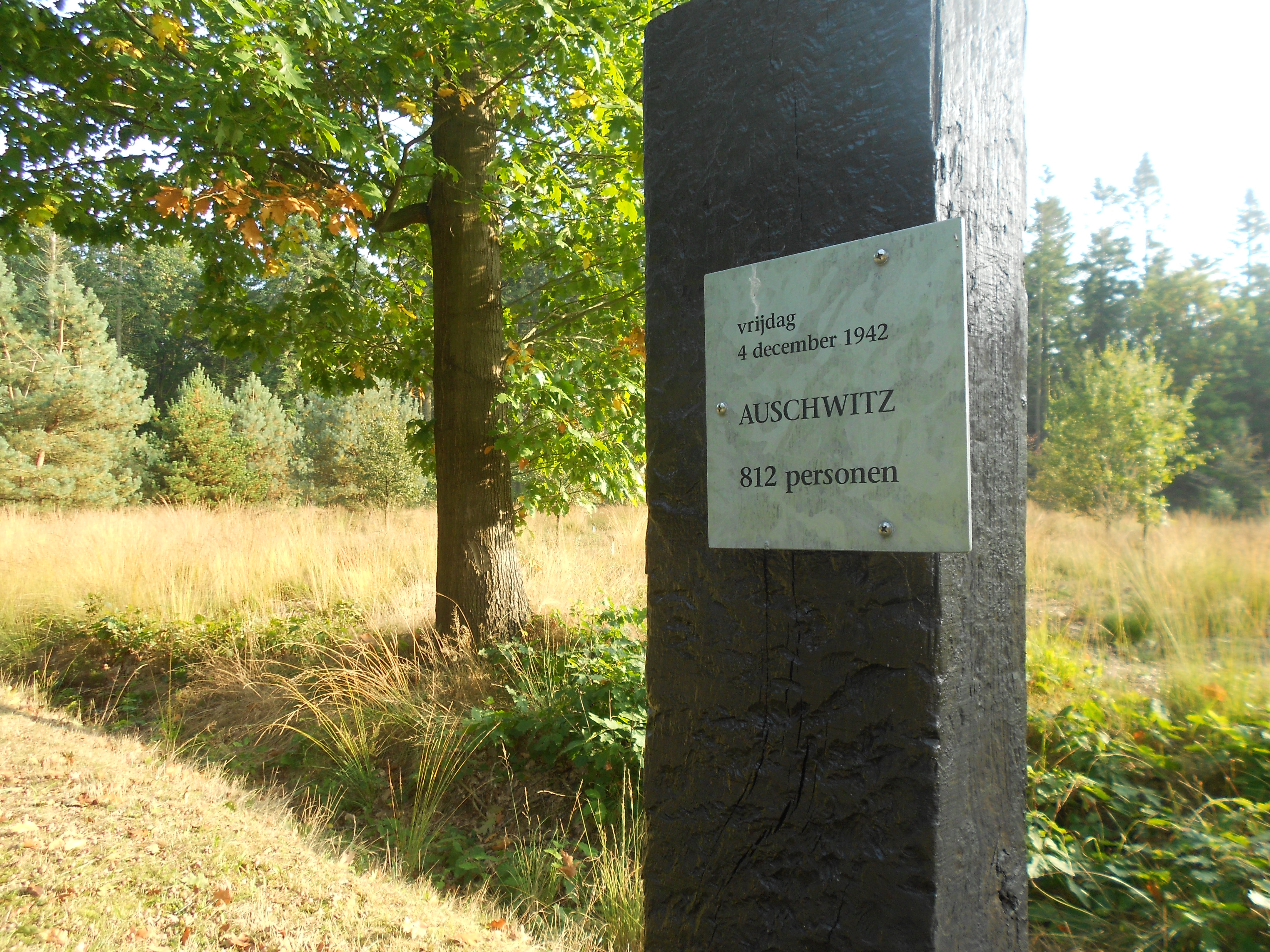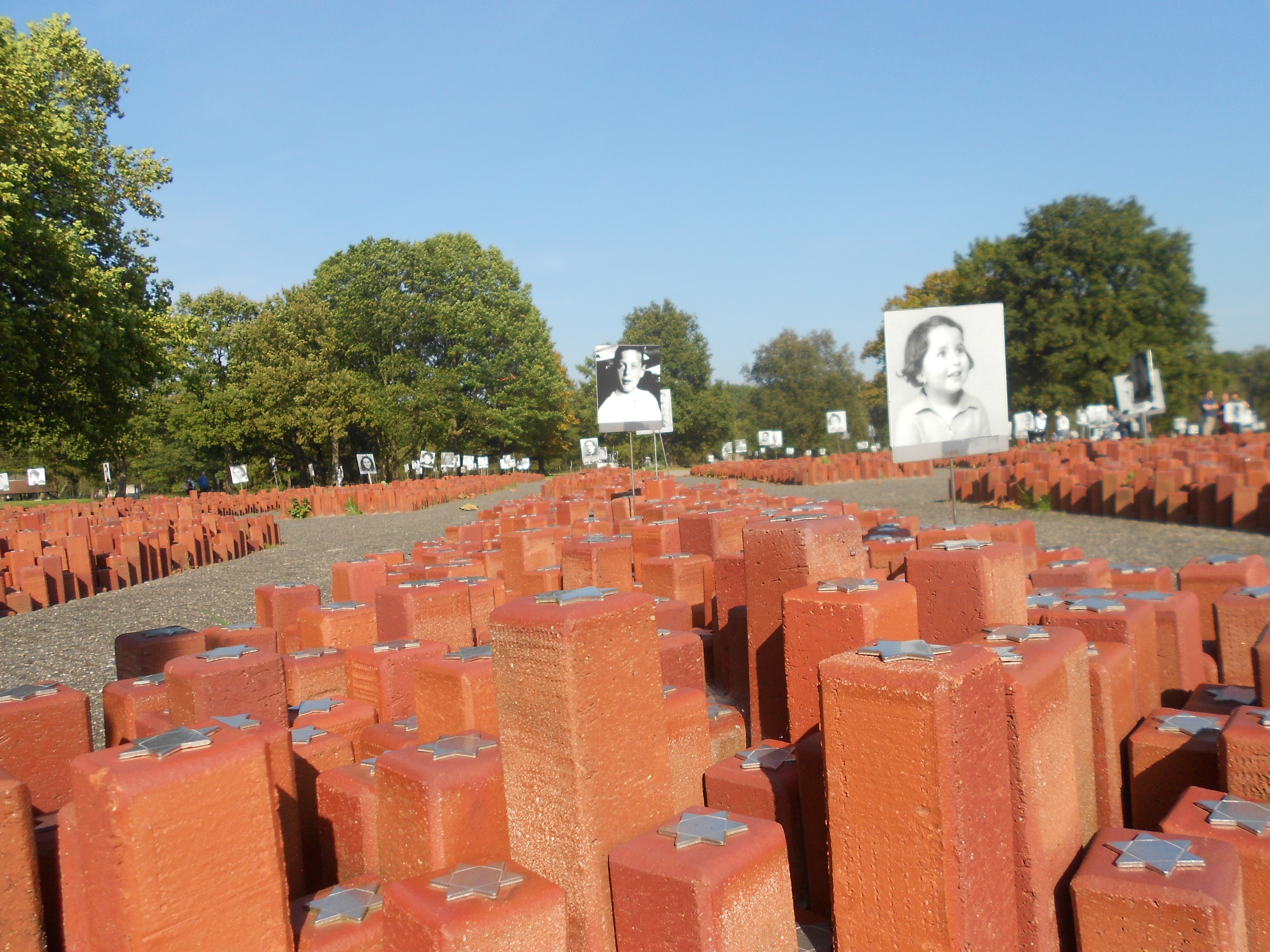 DSCN5306 Het is raar om op een stralend-mooie nazomerdag door Herinneringscentrum Kamp Westerbork te fietsen. De zon valt zo mooi door de bomen die zich al in herfsttooi wikkelen. En daar mag ik verdorie toch helemaal geen oog voor hebben op deze plek. Ik hoor mijzelf in een neerslachtige toga van lijden te hullen, maar het lukt me niet. Ik hoor Etty Hillesum zeggen dat ze bovenal hoopt in goede gezondheid terug te keren, voor ze op haar laatste reis naar Auschwitz vertrekt. Ik zie de 102000 stenen, die verwijzen naar de mensen die van hieruit werden gedeporteerd en niet terugkeerden. Ik zie de omhoog gekrulde rails die het verschrikkelijke eindpunt hier voor zovelen symboliseren. Maar die zon blijft er maar vrolijk overheen schijnen.