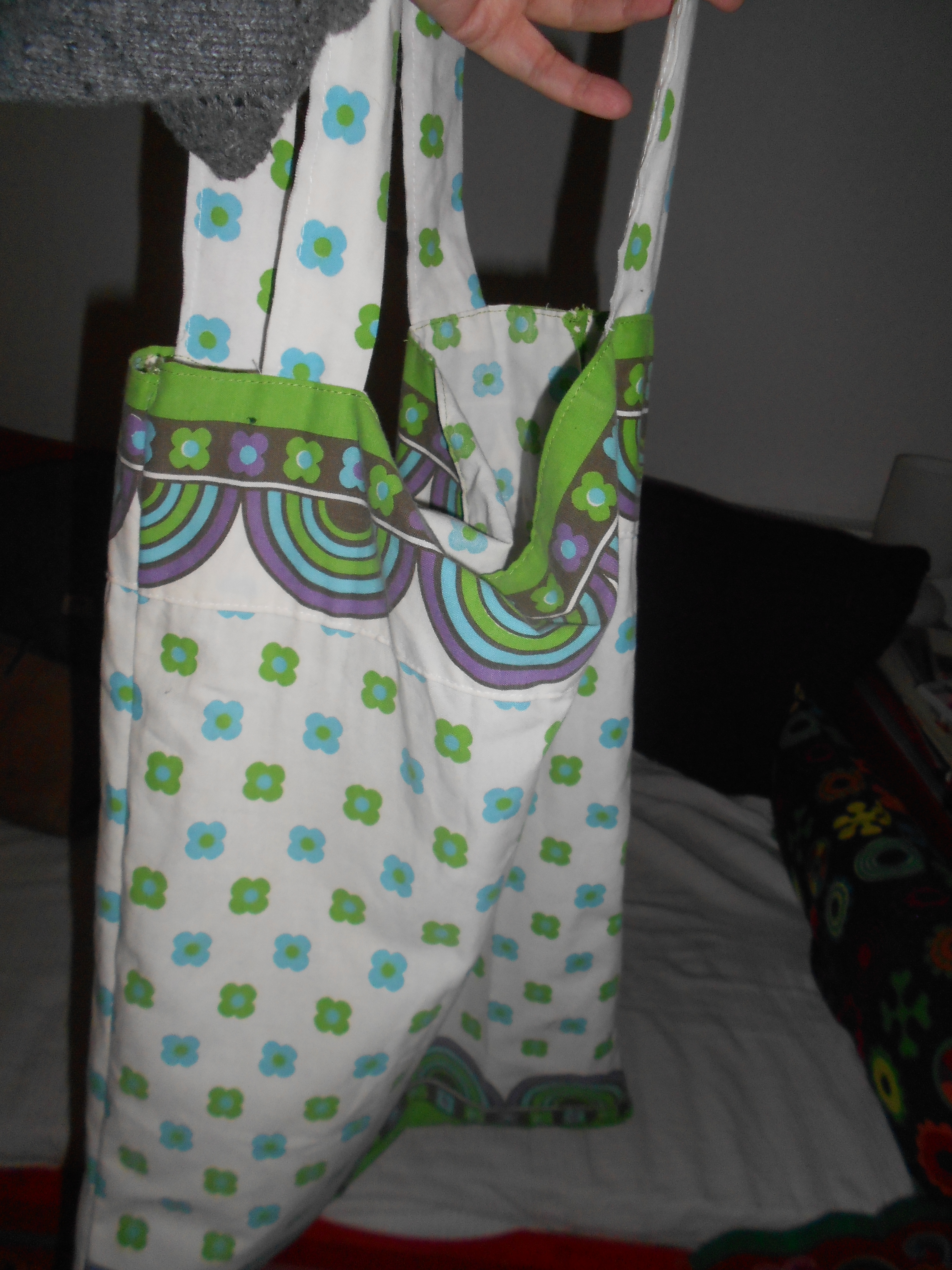Weet je nog dat ik die kast vol oude stofjes heb? Die kast die eigenlijk leeg zou moeten, maar waarvan het voorlopig al enorme winst zou zijn als ie gewoon iets minder vol zou zijn? In die kast liggen onder andere ook oude kussenslopen en tafellakens, met van die lekkere groene en oranje retro motieven. Ik heb ze ooit op een rommelmarkt meegenomen om er een rok van te maken, maar aangezien ik momenteel een gebrek aan tassen heb en een vriendinnetje van mij laatst een hele leuke kussenslooptas zelf gemaakt had, leek dit moment te roepen om een sloop tot tas te vermaken.