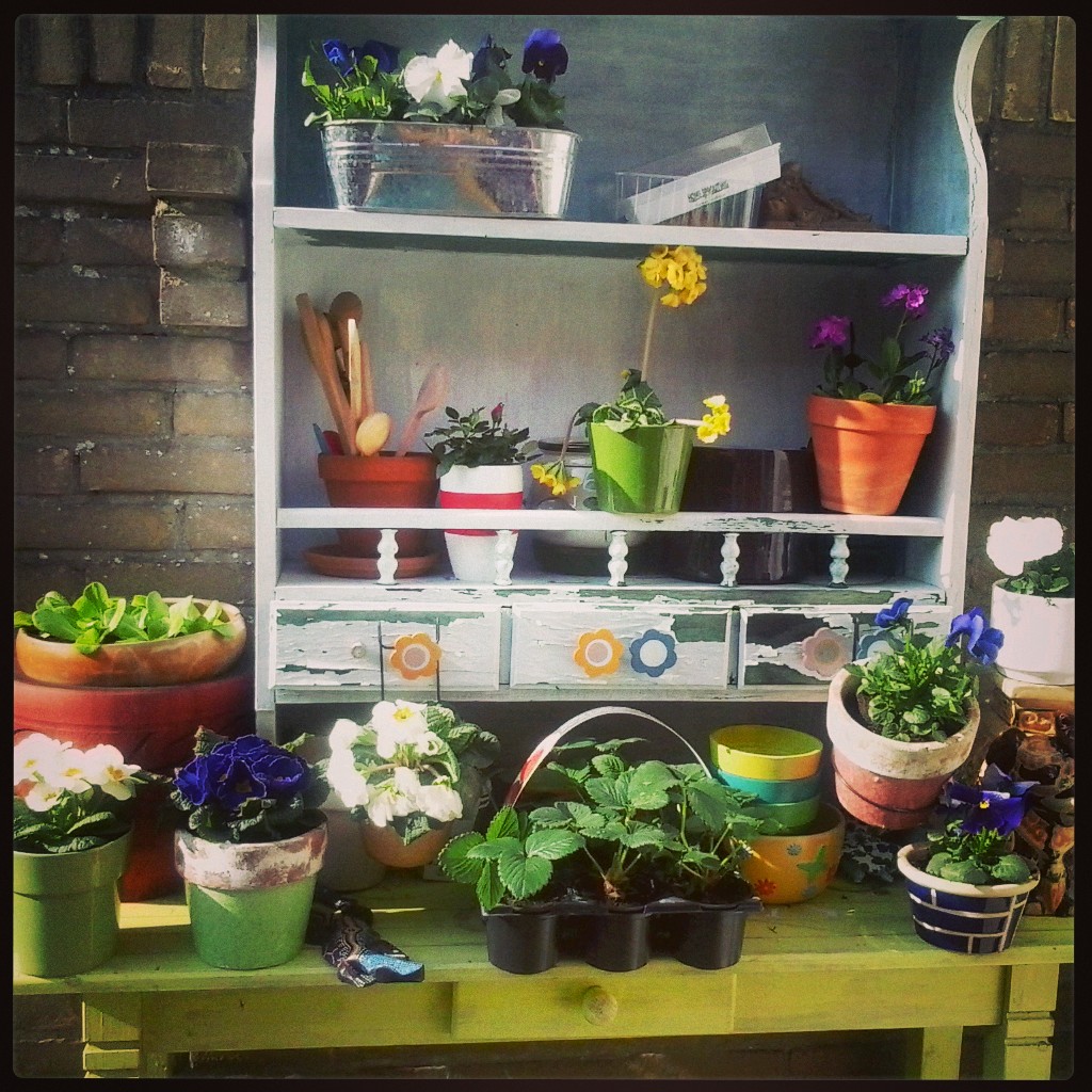 In mijn voornemen om elke dag een uur computertijd in te ruilen voor buitentijd zat geen enkele restrictie ingebouwd dat die wandeling of fietstocht niet ergens heen zou mogen gaan. Dus fietste ik gisteren bij wijze van middagpauze naar het tuincentrum, om me te vergapen aan hortensia’s in de prachtigste kleuren en roze bloesemende boompjes, en om helemaal verliefd te worden op een klein nectarineboompje, dat instant geluk beloofde, maar in mijn tuin noch fietstas paste. Met aardbeienplanten aan mijn stuur, een Helleborus in mijn ene fietstas, viooltjes in mijn andere fietstas en potgrond onder de snelbinders fietste ik volledig uit balans terug naar huis. En was heel blij. En bleef ook de hele dag heel blij. Met die vrolijke kleurtjes, de zon die er maar geen genoeg van kreeg om die leuke plantjes te beschijnen.