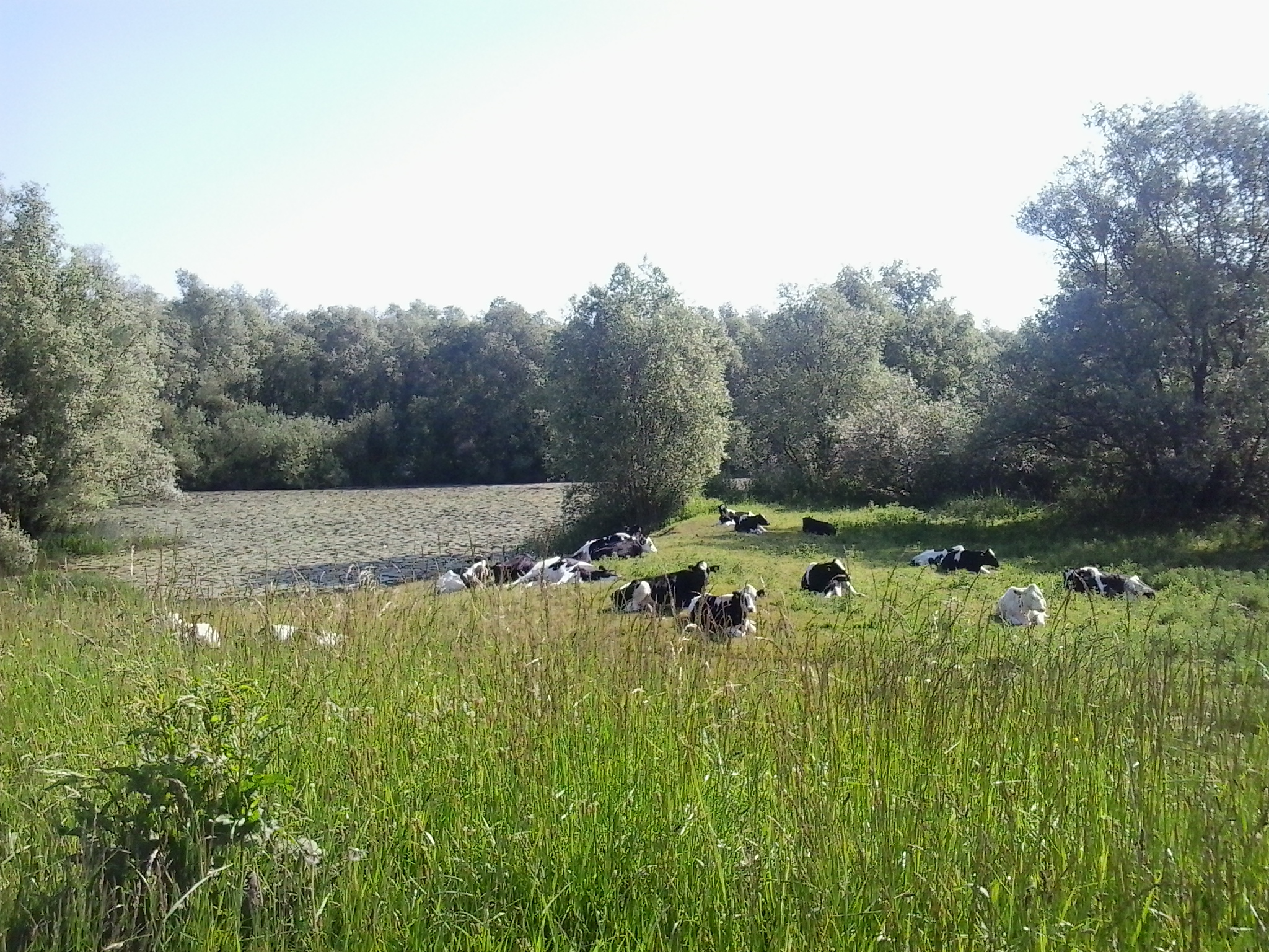 Nou ja, en wat er vervolgens gebeurde hoef ik denk ik al bijna niet meer op te schrijven, je ziet ‘m vast wel aankomen. Ik werd een beetje boos op mezelf, vond er van alles van dat ik niet in staat was om zomaar te genieten, zonder doel, woordeloos, en in die irritatie dreef ik steeds verder weg van de aanvankelijk zo mooie ervaring. En uiteindelijk was ik nog slechts een hoofd dat naar beneden gericht gefocust was op het ontwijken van koeienstront. Terwijl de zon volop scheen en reigers boven mijn hoofd druk in de weer waren met van alles en andere vogeltjes zongen als onze piepende buggy maar dan mooi op elkaar afgestemd. Zet toch alsjeblieft dat hoofd uit, dacht ik nog, maar toen waren de trappen van de spoorbrug al reeds in zicht. Het was te laat.